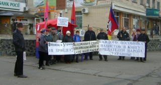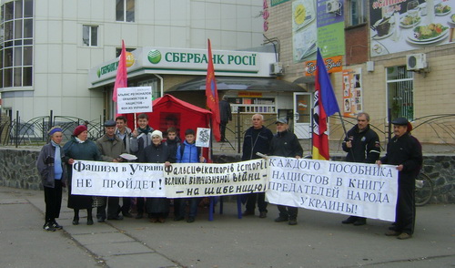 "Альянс регионалов, оранжистов и нацистов - вон из Украины", "Каждого пособника нацистов - в Книгу предателей народа Украины", "Фашизм в Украине не пройдет!", "Фальсифікаторів історії Великої Вітчизняної війни - на шибеницю!".