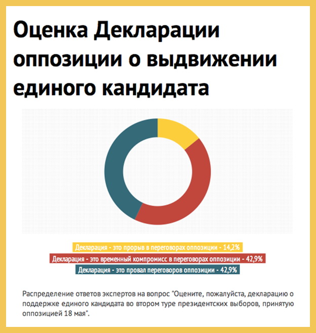 Так же пессимистично эксперты оценили и декларацию о поддержке единого кандидата во втором туре президентских выборов, принятую оппозицией 18 мая на митинге в Киеве. Только 14,2% опрошенных считают декларацию "прорывом в переговорах о выдвижении единого кандидата от оппозиции". При этом 42,9% респондентов считают подписанный документ "провалом", и еще столько же (42,9%) – "временным компромиссом в переговорах о выдвижении единого кандидата".