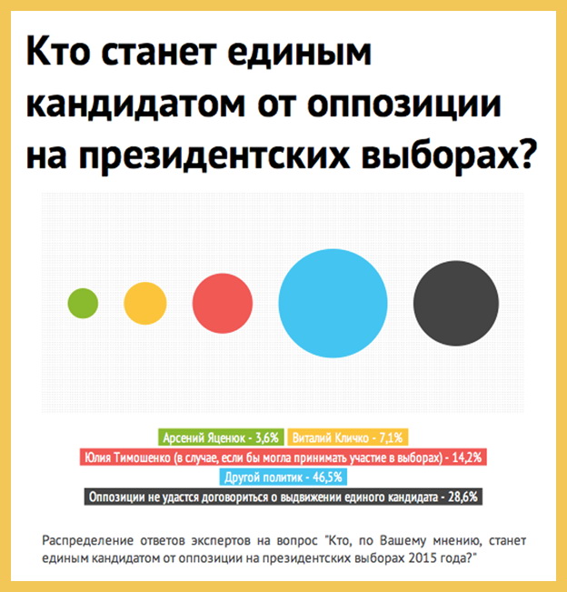 Что касается конкретных имен политиков, имеющих шансы быть выдвинутыми в качестве единого оппозиционного кандидата на президентских выборах, то прогнозы экспертов распределились следующим образом: Арсений Яценюк – 3,6%, Виталий Кличко – 7,1%, Юлия Тимошенко (в случае, если бы она могла принимать участие в выборах в качестве кандидата) – 14,2%. Почти половина опрошенных экспертов (46,5%) считает, что достойных кандидатов среди сегодняшних лидеров оппозиции нет, и в качестве единого кандидата будет выдвинутдругой политик. Кроме того, 28,6% респондентов уверены, что оппозиции не удастся договориться о выдвижении единого кандидата на президентских выборах-2015.