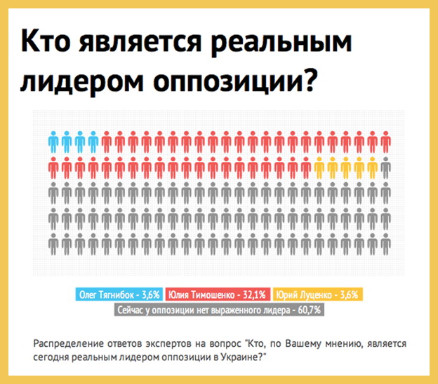 По мнению большинства опрошенных экспертов, в настоящее время в рядах украинской оппозиции явный лидер не проявлен. Так считают 60,7% респондентов. 32,1% экспертов назвали реальным лидером украинской оппозиции Юлию Тимошенко, по одному эксперту (3,6%) – Олега Тягнибока и Юрия Луценко, соответственно. Что касается Арсения Яценюка и Виталия Кличко, то никто из опрошенных экспертов не назвал их в качестве реальных лидеров оппозиции.