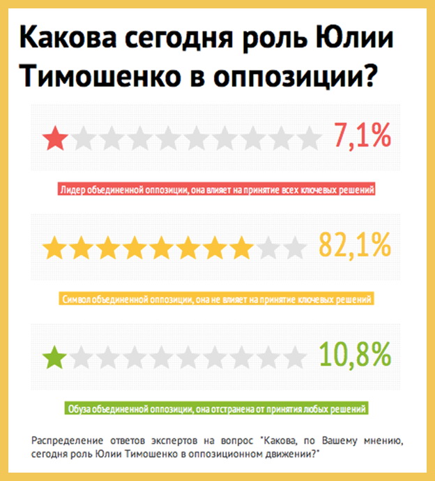 При этом подавляющее большинство экспертов (82,1%) считает, что сама Юлия Тимошенко, находящаяся в местах лишения свободы, сегодня не влияет на принятие решений в оппозиции, а является только ее "символом". 10,8% респондентов высказали мнение, что Юлия Тимошенко отстранена от принятия каких-либо решений и является "обузой" объединенной оппозиции. "Юлия Владимировна Тимошенко – это крест объединенной оппозиции, который та вынуждена нести", – так обрисовал сложившуюся ситуацию политолог Дмитрий Джангиров. Лишь 7,1% опрошенных экспертов заявили, что Юлия Тимошенко – это "лидер" объединенной оппозиции, который влияет на принятие всех ключевых решений.