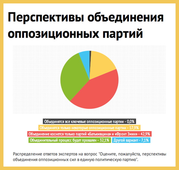 Участники опроса сдержанно прокомментировали перспективы объединения оппозиционных политических сил. 17,9% респондентов считает, что объединиться смогут только некоторые оппозиционные партии. 42,9% – только партии "Батькивщина" и "Фронт змин". Около трети опрошенных (32,1%) уверены, что объединительный процесс будет провален.