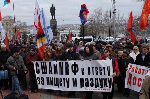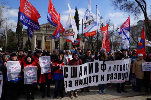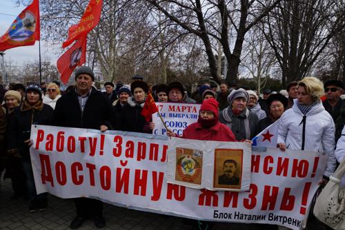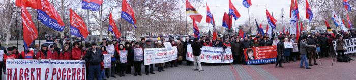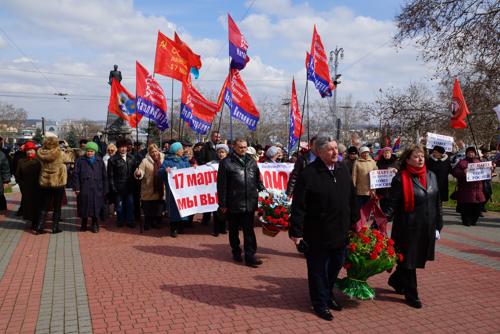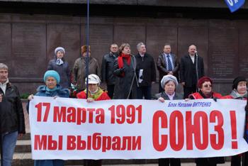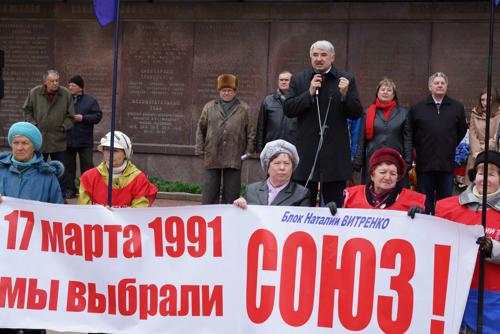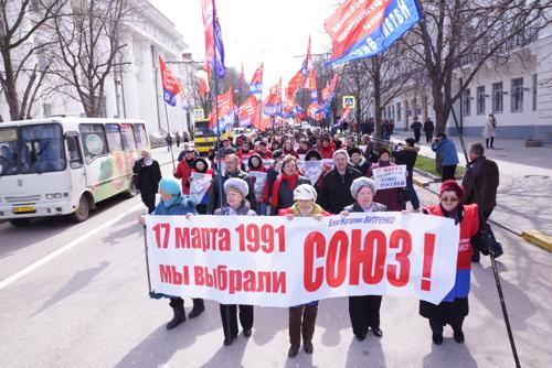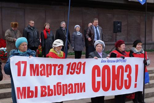 Депутата Верховного Совета СССР, полковника Виктора Алксниса знают как принципиального, честного, достойного политика и борца не только в России, но и на всем пространстве нашей великой Родины – СССР. Депутаты ВРУ предыдущих созывов Наталия Витренко, Владимир Марченко всегда на острие борьбы с бандеровским отребьем, против украинизации и фашизации, против беспредела власти, за Евразийский Союз с Россией, Беларусью, Казахстаном. Представители около 30 политических партий и общественных организаций пришли, чтобы встретиться c патриотами России и Украины. Красочная колонна, во главе которой шли политики-борцы, прошла улицей Ленина до Мемориала защитникам Севастополя. Гордо развивались флаги Детей войны Севастополя, Блока Наталии Витренко, Союзного движения "17 марта", Партии "Киевская Русь", Коммунистической Марксистско-Ленинской партии. Со своими штандартами прошли казаки Севастополя и Крыма, представители пророссийских и молодежных организаций "Молодая гвардия" и "Прорыв". Призывы на транспарантах наотмашь били зажравшуюся власть по морде: "Навеки с Россией!", "США и МВФ к ответу за нищету и разруху!", "17 марта 1991 года мы выбрали Союз!", "Воля народа Украины – Союзу быть!".