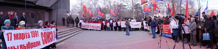 Митинг, посвященный 22-й годовщине Всесоюзного Референдума 1991 года открыл депутат Севастопольского городского совета Евгений Дубовик. Выступающие сменяли друг друга, а интерес к акции только нарастал. К митингующим присоединялись горожане и гости города-героя, которые прогуливались на площади Нахимова в последний день Масленицы. Бурными овациями и криками "ура" были встречены выступления: