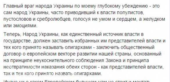В частности, он признался, что "борьба с сепаратизмом" в Днепропетровске велась незаконными методами с привлечением людей с криминальным прошлым, а относительно общей политической ситуации в стране заявил следующее: "Главный враг народа Украины по моему глубокому убеждению - это сам народ Украины, часто приводивший к власти популистов, пустословов и сребролюбцев, голосуя не умом и сердцем, а желудком или эмоциями".