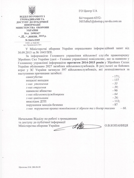 По информации Главного управления военной службы правопорядка Вооруженных Сил Украины, количество небоевых потерь за период 2014-2015 гг. составляет 597 военнослужащих. Об этом говорится в ответе Министерства обороны на запрос общественной организации Центр UA.