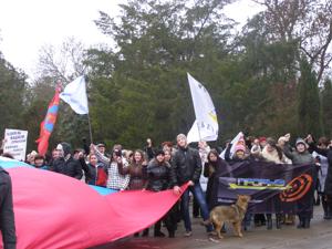 На митинге в Симферополе секретарь Крымского рескома ПСПУ Надежда Полякова сообщила о том, что такие акции сегодня одновременно проходят по всей Украине по инициативе и силами ПСПУ и передала поздравления крымчанам от лидера партии Наталии Витренко.