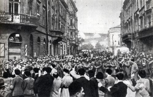 Тысячи жителей города Львова приветствуют солдат Красной Армии, входящих в город в ходе "освободительного похода" на Западную Украину.