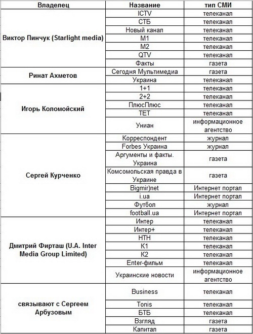 Как видно из вышеприведенной таблицы, формируют общественное мнение Украины несколько олигархов – Пинчук, Ахметов, Коломойский, Курченко, Фирташ и Арбузов – и подчиненные им структуры.