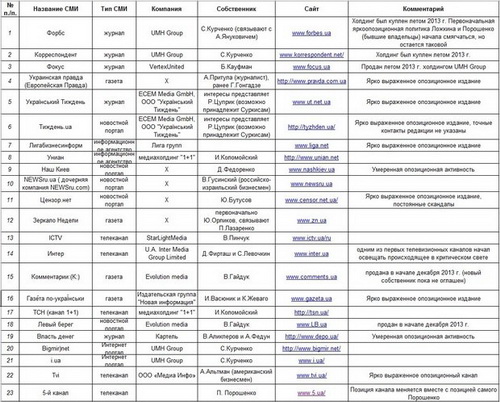 "Среди телеканалов, проявляющих наибольшую активность, – TVi (владелец – американский бизнесмен А.Альтман, со скандалом сменивший руководство канала в апреле 2013 г.), "Интер" (владельцы – Д.Фирташ и С.Левочкин, осудившие разгон демонстрантов 30 ноября), "5-й канал" (владелец – П.Порошенко, лазивший на трактор) и канал "1+1" (служба ТСН) (владелец – И.Коломойский, с которым связывают партию "Свобода").