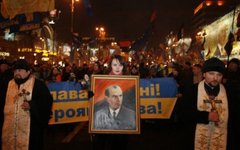 Не Тараса Шевченко! Не Михаила Грушевского! Не Симона Петлюры! Даже не основателя ОУН Евгена Коновальца, который, хотя и сотрудничал с гитлеровцами, но был ликвидирован еще до начала Второй мировой войны и, следовательно, формально не может нести прямой ответственности за преступления военного времени. Это ведь факт: якобы демократический "евромайдан" проходил на фоне изображения лидера украинских фашистов, пособника немецких оккупантов, террориста и убийцы Степана Бандеры.
