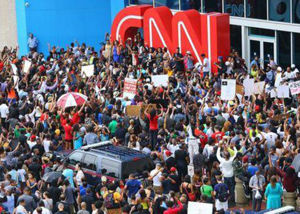 Тысячи людей пришли к зданию штаб-квартиры новостного телеканала CNN, чтобы выразить протест против того, как канал освещает события в городке Фергюсон. Там уже 10 дней не стихают погромы и столкновения с полицией, которые начались после того, как полицейский застрелил чернокожего подростка шестью выстрелами в упор.
