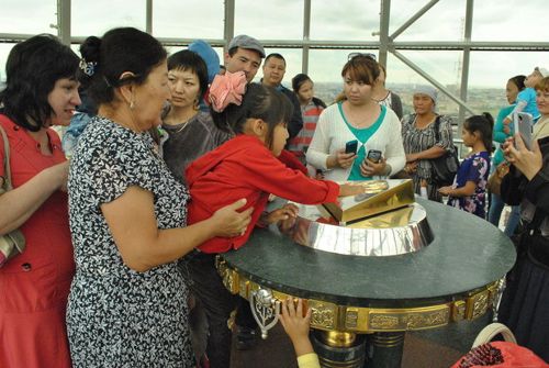Так что все здесь логично, все понятно, все предсказуемо. Центральная точка города – монумент "Байтерек", огромное древо мира из стекла и стали, где на высоте 97 метров над землей в золотом треугольнике находится оттиск правой ладони елбасы. Чтобы подняться наверх на лифте, нужно купить билет, чтобы вложить свою ладонь в оттиск – отстоять приличную очередь. Более подходящее место, которое бы символизировало единство казахского народа, трудно себе представить.