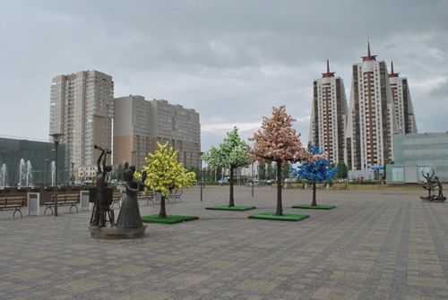 К сожалению, живые деревья в новой столице пока что чувствуют себя неважно, теряются среди небоскребов. Поэтому им на смену приходят искусственные.