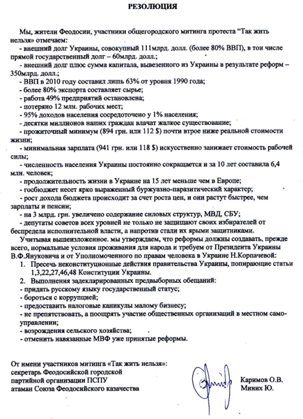 1 апреля в Феодосии прогрессивные социалисты совместно с Союзом Феодосийского казачества провели митинг под лозунгом "Так жить нельзя!". Несмотря на попытки местных властей запретить проведение акции, митинг состоялся. На митинге была принята резолюция с требованием к властям обеспечить конституционные права граждан.