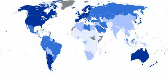 Страны по индексу развития человеческого потенциала: тёмно-синий - более развитые, светло-синий - менее
