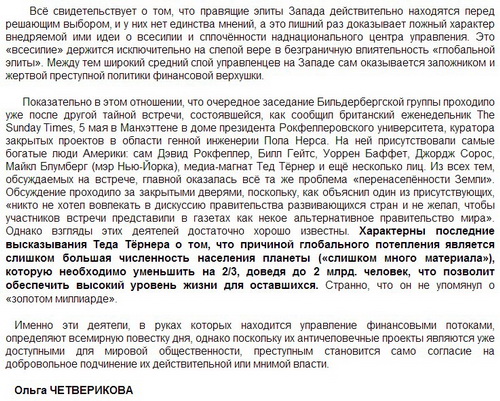 Что касается России, то имеется множество признаков того, что та часть мировой элиты, которая определяет экономическую и военную политику и контролирует СМИ, ни в коем случае не включает народы России в число тех, кто имеет шанс попасть в спасательную шлюпку "золотого миллиарда".