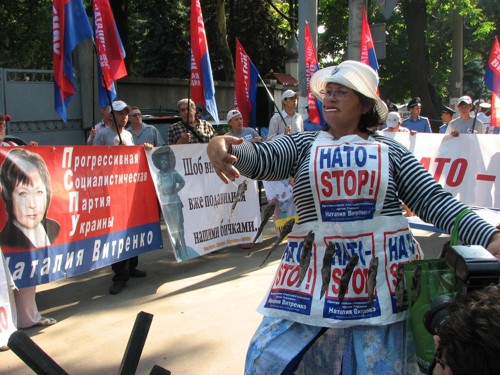 Была среди персонажей акции и колоритная "тётя Соня с Привоза", которая демонстрировала не только свои пышные формы, но и связку гнилых бычков, "любовно" ею обобранных для НАТОвских генералов.