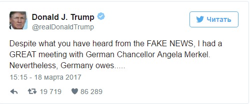 "Несмотря на то что вы слышали по фейковым новостям, у меня была отличная встреча с немецким канцлером Ангелой Меркель. Тем не менее, Германия должна огромные суммы денег НАТО и Соединенным Штатам. Надо платить больше за мощную и очень дорогую оборону, которую мы предоставляем Германии!" - написал Трамп в микроблоге Twitter.