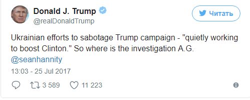 "Украинские попытки саботировать кампанию Трампа - "тихо работают, чтобы подтолкнуть Клинтон". Так где же расследование генерального прокурора", - написал президент США.