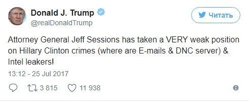 Кроме того, глава американского государства обвинил генпрокурора Джеффа Сешнса в слабой позиции по отношению к преступлениям, которые, по мнению Трампа, совершила его оппонент на выборах Хилари Клинтон.