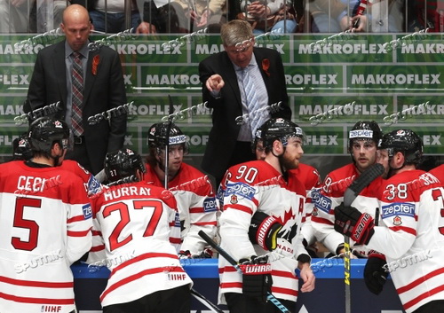 В центре на фото главный тренер сборной Канады Билл Питерс во время матча группового этапа чемпионата мира по хоккею между сборными командами Белоруссии и Канады.