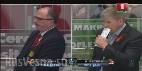 Тренеры канадской сборной по хоккею провели матч против команды Белоруссии на чемпионате мира в России с прикрепленными к одежде георгиевскими лентами.