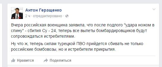 Фактически как ни крути, Турчинов позволил сбивать всем и Турецкие самолеты! Но что же произошло? Российские СУ уничтожали позиции ИГИЛ на границе с Турцией, а туркам это не понравилось, потому что с территории, где господствуют банд формирования, идет дешевая нефть. Идет в Турцию. Нефть, которая принадлежит Сирии. Турция фактически и начала Сирийский конфликт несколько лет назад. Бандформирования шли с ее территории, шло оружие.