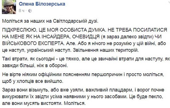 «Молитесь за наших на Светлодарск дуге, - призвала националистка. - Подчеркиваю, это мое личное мнение. Не надо ссылаться на меня как на инсайдера, очевидца (я сейчас далеко оттуда) или военного эксперта. Но. Или я ничего не понимаю в этой войне, или это наступление, украинское наступление. Освобождение наших территорий.