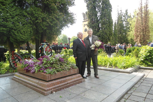 3) Заступник голови Львівської обласної організації війни та праці Куцин П. Г. та Покровський О. С. покладають квіти до могили Героя Радянського Союзу, легендарного розвідника Кузнєцова М. І. на Пагорбі Слави; м. Львів, 9.05.2016 р.;