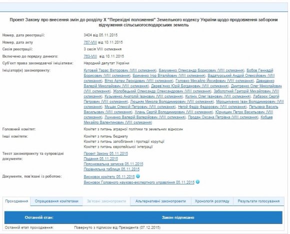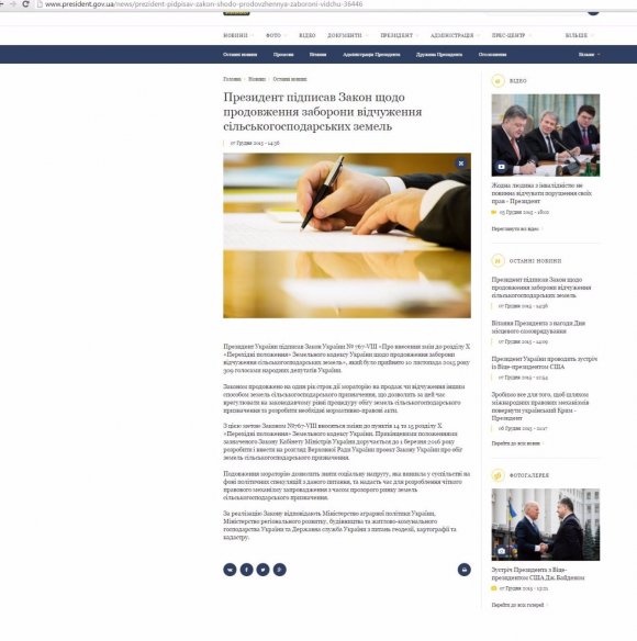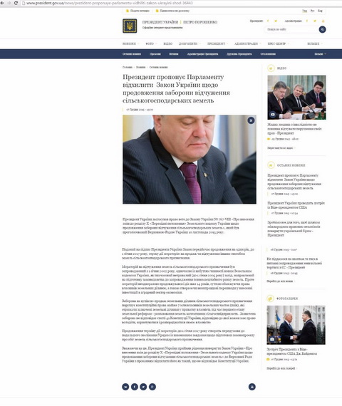 Официальное интернет-представительство президента Украины 7 декабря разместило ложную новость о применении Порошенко право вето к законопроекту о продлении моратория на продажу земель сельскохозяйственного назначения до 1 января 2017 года.