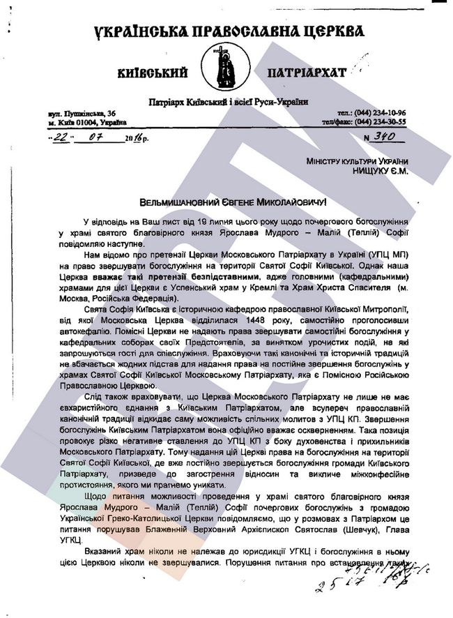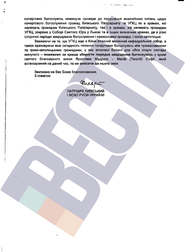 Еще одно письмо Филарета касается просьбы Главы УГКЦ Святослава Шевчука о совместных с УПЦ КП служениях в храме князя Ярослава Мудрого, Малой (Теплой) Софии (трапезная св. Софии).