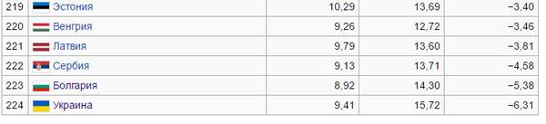 В этом списке Россия стоит на 26 мест выше Украины – между Данией и Словакией. ЦРУ сообщает, что в России продолжается естественная убыль населения, хотя данные у отечественных служб статистики иные.