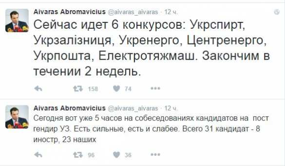 Но вполне понятно, что Абромавичус также сообщил, что в течение 2 недель закончатся конкурсы по компаниям «Укрспирт», «Укрзализныця», «Укрэнерго», «Центрэнерго», «Укрпошта», «Электротяжмаш».