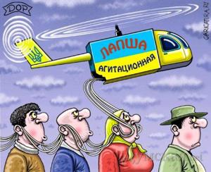 В захваченных сепаратистами регионах люди массово пишут в своих "Фейсбуках": "Поверьте, я дочь шахтера, пятьдесят лет живу на Донбассе, здесь не все так однозначно. Абсолютное большинство жителей выступают за единую соборную Украину во главе с исполняющим обязанности президента и спикера. Они каждый день целуют фото Турчинова, распечатанное на цветном принтере. Лишь небольшая кучка террористов, финансируемая Кремлем, хочет отделения юго-востока. Весь остальной народ их презирает". Проклятые диверсанты ГРУ каждый день устраивают массовые провокации на блокпостах. Они захватывают белые джипы, напихивают в них оружие и визитки Яроша, затем под видом "правосеков" организуют перестрелки и трупы. Да у них руки по локоть в крови. На самом деле в Донецк едут мирные, интеллигентные люди, главная цель которых убедить жертв пропаганды в добрых намерениях временной власти. Они вооружены исключительно в целях самообороны, поскольку на юго-востоке много уголовных элементов, которые угрожают демократическим ценностям свободного мира.