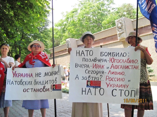 Собравшиеся держали в руках плакаты антиНАТОвского и антиамериканского содержания:"Конвенцию по Черному морю никто не отменял!, Черноморский флот России! Торпедные аппараты -товсь!, Украина, не молчи!НАТОвских бандитов останови!, НАТО бомбило:позавчера - Югославию, вчера - Ирак и Афганистан, сегодня - Ливию,А завтра?.. Россию и Украину...НАТО СТОП!
