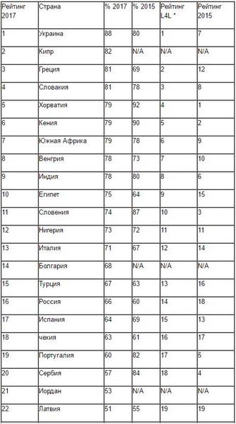 Среди 41 страны первое место занимает Украина – 88% респондентов ответили утвердительно. Дания, Норвегия и Финляндия имеют самые низкие проявления коррупции в бизнесе.