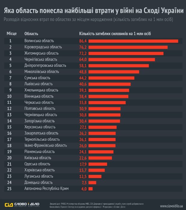 Как видим, диаграмма показывает численность погибших украинских силовиков на миллион населения в разрезе по областям. Проведя несложные математические вычисления (сложив циферки в столбик), получаем, что на миллион украинцев погибло 905,5 человек. Из графика видно, что за основу взято всё население Украины, включая Крым и Донбасс. Но мы, так и быть, возьмём официальные данные Укрстата в 42,726 миллиона человек.