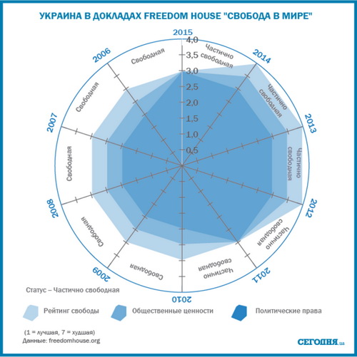 В последнем докладе Международной правозащитной организации Freedom House, несмотря на определенное улучшение показателей (в индикатору "рейтинге свободы" Украина улучшила показатели на 0.5 пункта до 3, по "политическим правам" – на 1 пункт до 3) Украина все же относится к категории "частично свободных" стран.