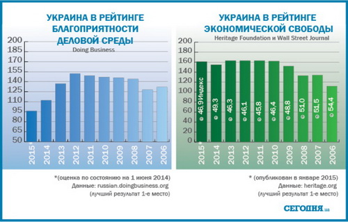 Вместе с тем, последний рейтинг экономической свободы, который в январе 2015 года опубликовал американский исследовательский институт Heritage Foundation (исследование готовится совместно с изданием Wall Street Journal), зафиксировал ухудшение ситуации в Украине – 161 место из 178 стран.