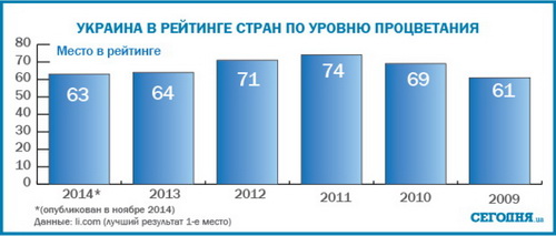 В то же время Украина заняла 63-е место (из 142 государств) в мировом рейтинге процветания, который в ноябре 2014 года опубликовала международная аналитическая организация Legatum Institute. За год страна поднялась на одну позицию. Худший результат за последние годы был зафиксирован в 2011 году, когда страна заняла 74 место.