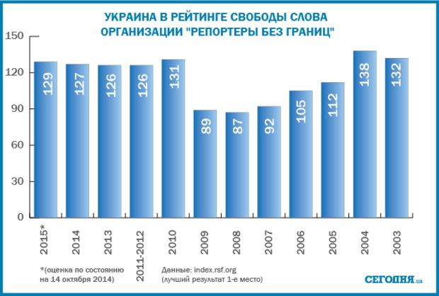 Так, в рейтинге международной правозащитной организации Репортеры без границ Украина по уровню свободы прессы в 2014 году опустилась на два пункта – до 129 места из 180 стран. Отмечается, что Украина оказалась в группе несвободных в плане свободы СМИ стран. Всего в рейтинг входят 180 стран.