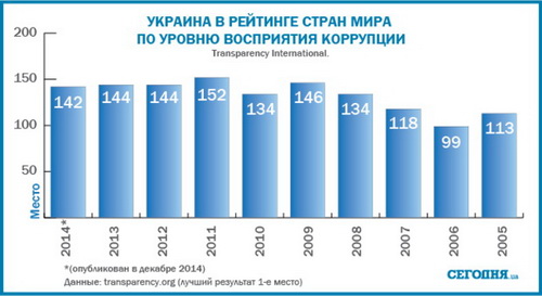 В декабре 2014 организация по борьбе с коррупцией Transparency International обнародовала результаты нового Индекса восприятия коррупции 2014. И, как оказалось, спустя год после Майдана Украина, получив лишь один дополнительный балл, по сравнению с 2013 годом, остается в клубе тотально коррумпированных государств: 26 баллов из 100 возможных и 142 место из 175 позиций.