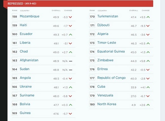 При этом Украину отнесли в категорию стран с "репрессивной" экономикой. Всего туда входят 23 страны, в том числе Афганистан, Судан, Куба, Венесуэла и даже Северная Корея. Тем не менее, указывается, что Украина улучшила свою позицию на одно место.