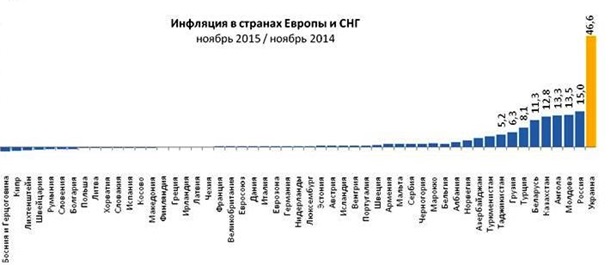 Средний показатель инфляции в большинстве стран Европы и СНГ в 2015 году составил 2%. При этом, большая часть стран Центральной и Западной Европы имеют околонулевую инфляцию.