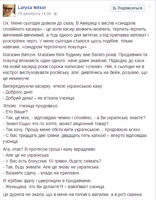 По ее словам, при обслуживании она несколько раз попросила кассира перейти и на украинский язык, но та этого не сделала.