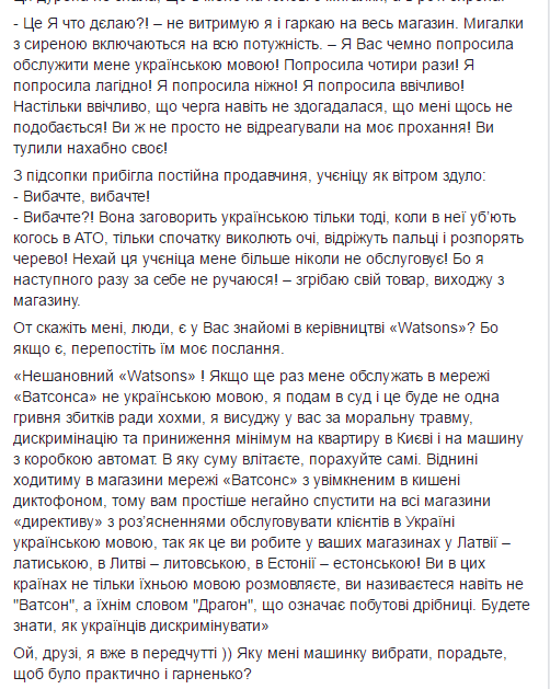 "В выходные буду ходить в магазины сети "Ватсон" с включенным в кармане диктофоном", -предупреждает она. - Будете знать, как украинцев дискриминировать".
