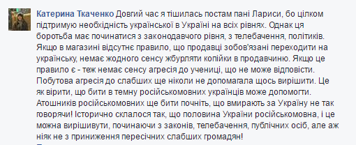 В своем посте она также угрожает сети, что если в следующий раз ее не будут обслуживать по-украински, она подаст в суд и остудит за унижение минимум квартиру в Киеве и машину с коробкой- автомат.