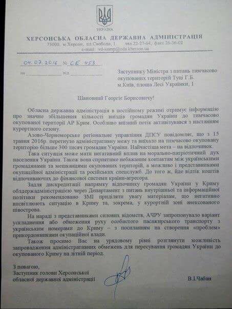 Суть документа в том, что государственная администрация Херсона и пограничники жутко обеспокоены тем, что люди едут в Крым из «украины», а, по их мнению, цитата: