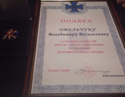 Кстати, руководитель "Честного слова" не особо скрывает, что сотрудничает с СБУ. "Вестям" попало фото благодарности с нагрудным знаком Владимиру Омельчуку от главы СБУ Валентина Наливайченко (на фото). Также об активном сотрудничестве радикальной группировки со спецслужбой говорит видео на канале ЧС, где лично Валентин Наливайченко, находясь в здании СБУ, говорит радикалам, что помнит, с кем 24 февраля зашел в эти помещения, которые были свободны: "Шли со мной именно вы. Не в плане личности. Там был и Дмитрий Ярош, и были девочки и мальчики, просто с Майдана пришли. Как не спали ночью, так и зашли 24 февраля..." Омельчук подтверждает сотрудничество его организации с СБУ: "Мы совместно с СБУ противодействуем сепаратистам, оппозиции, то есть тем, деятельность которых направлена на дезорганизацию системы обороны страны и дискредитацию органов государственной власти". Отметим, что в таком определении под "оппозицию" можно подвести любых недовольных властями.